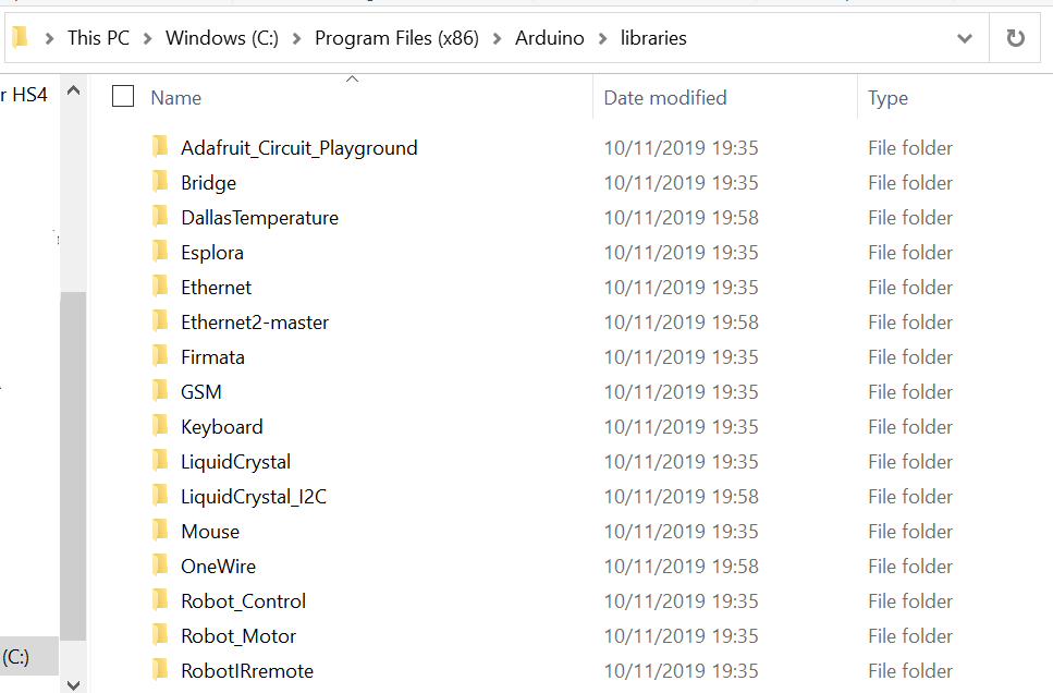 2. Copy the five extracted individual folders to the libraries folder that is located in the same folder as the Arduino.exe. eg. "C:\Program Files (x86)\Arduino\librariesā.