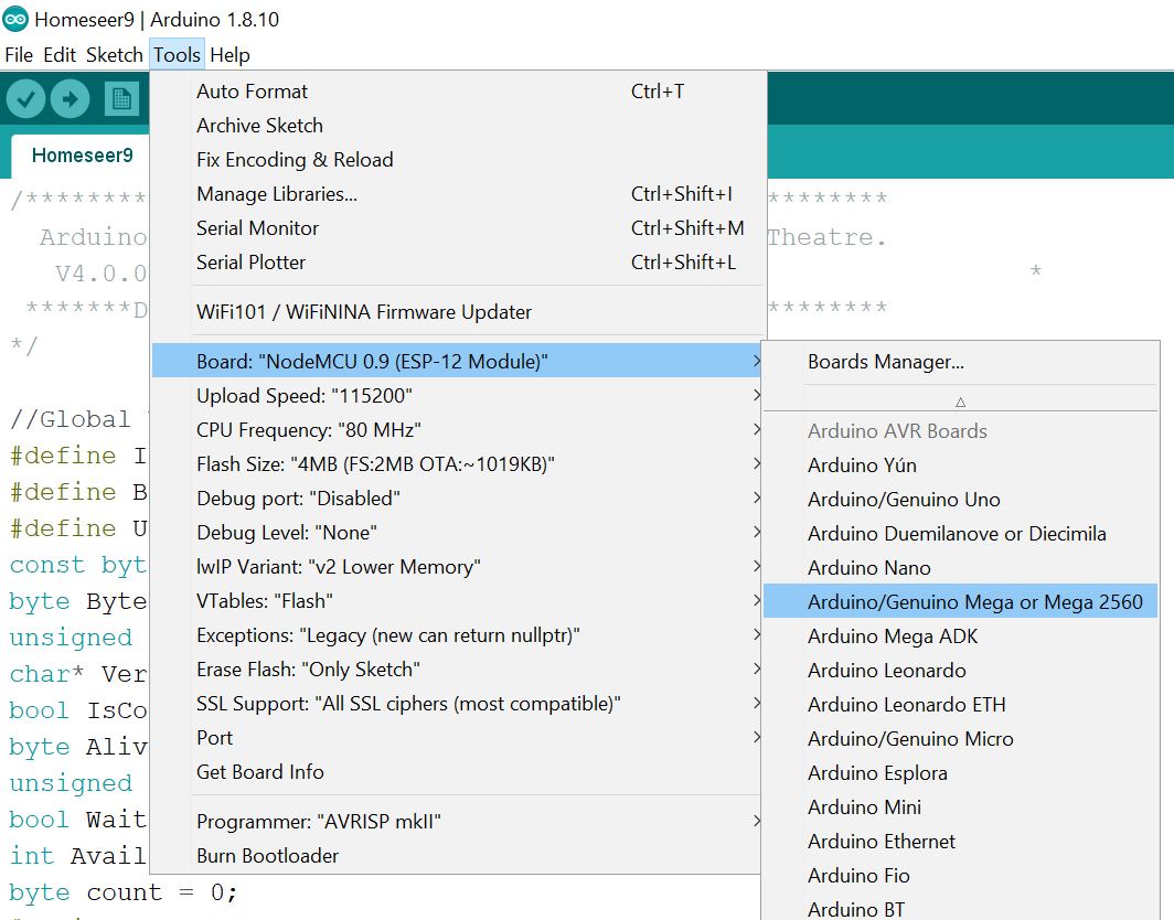 2. Click Tools then Board: and select your board type. (eg.Arduino Mega)